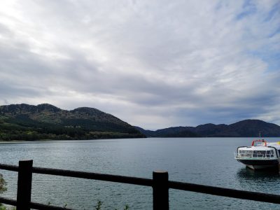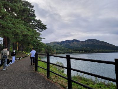 たつこ姫伝説のお話を聞きながら、田沢湖に到着です